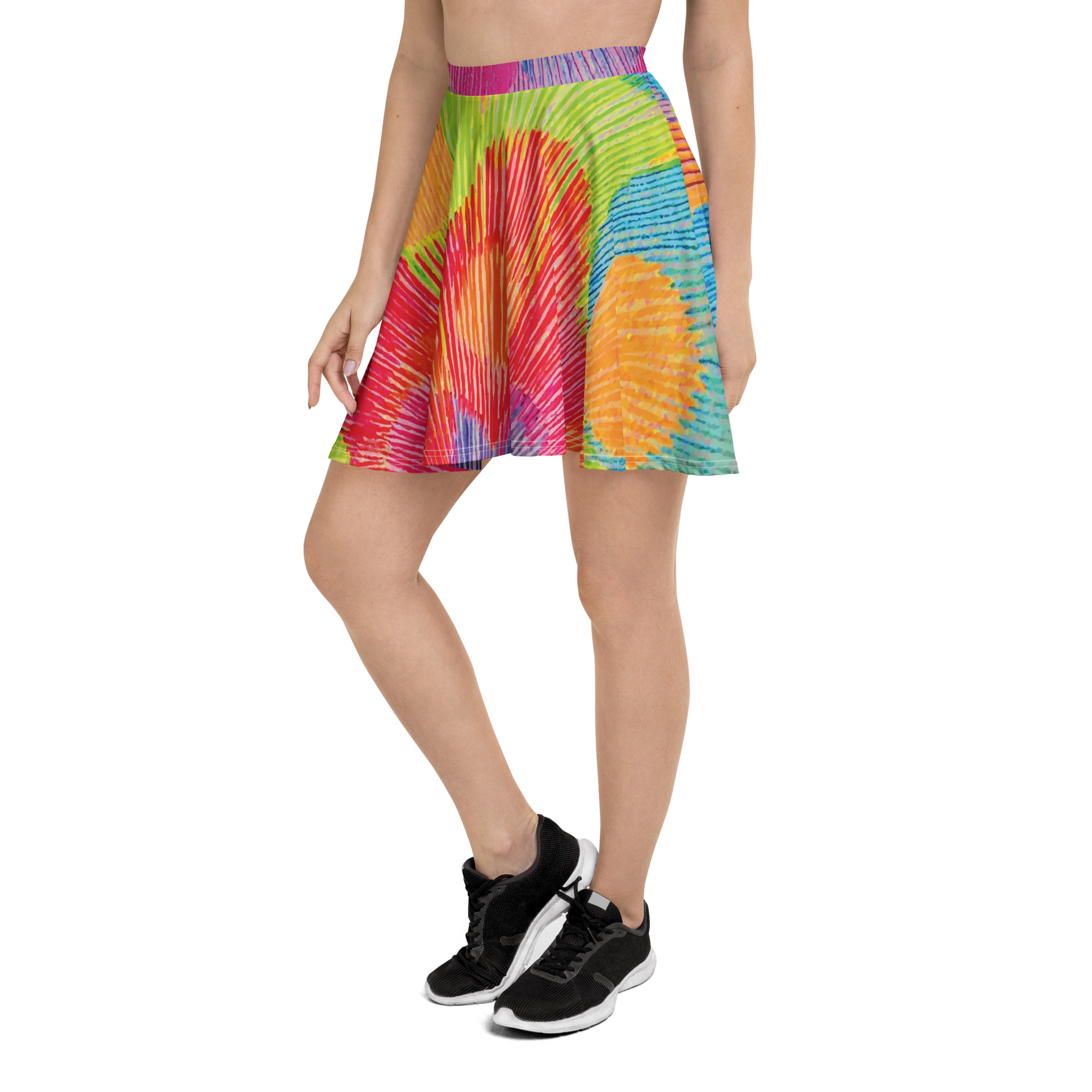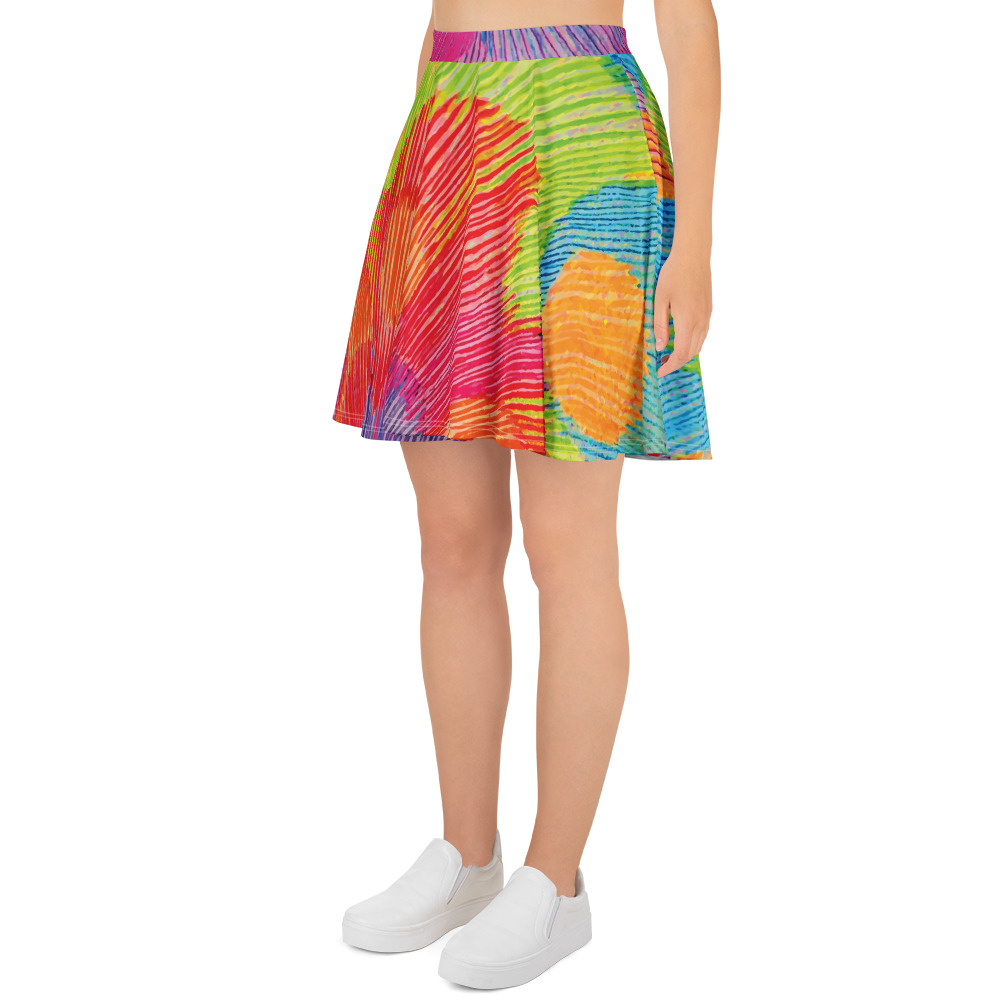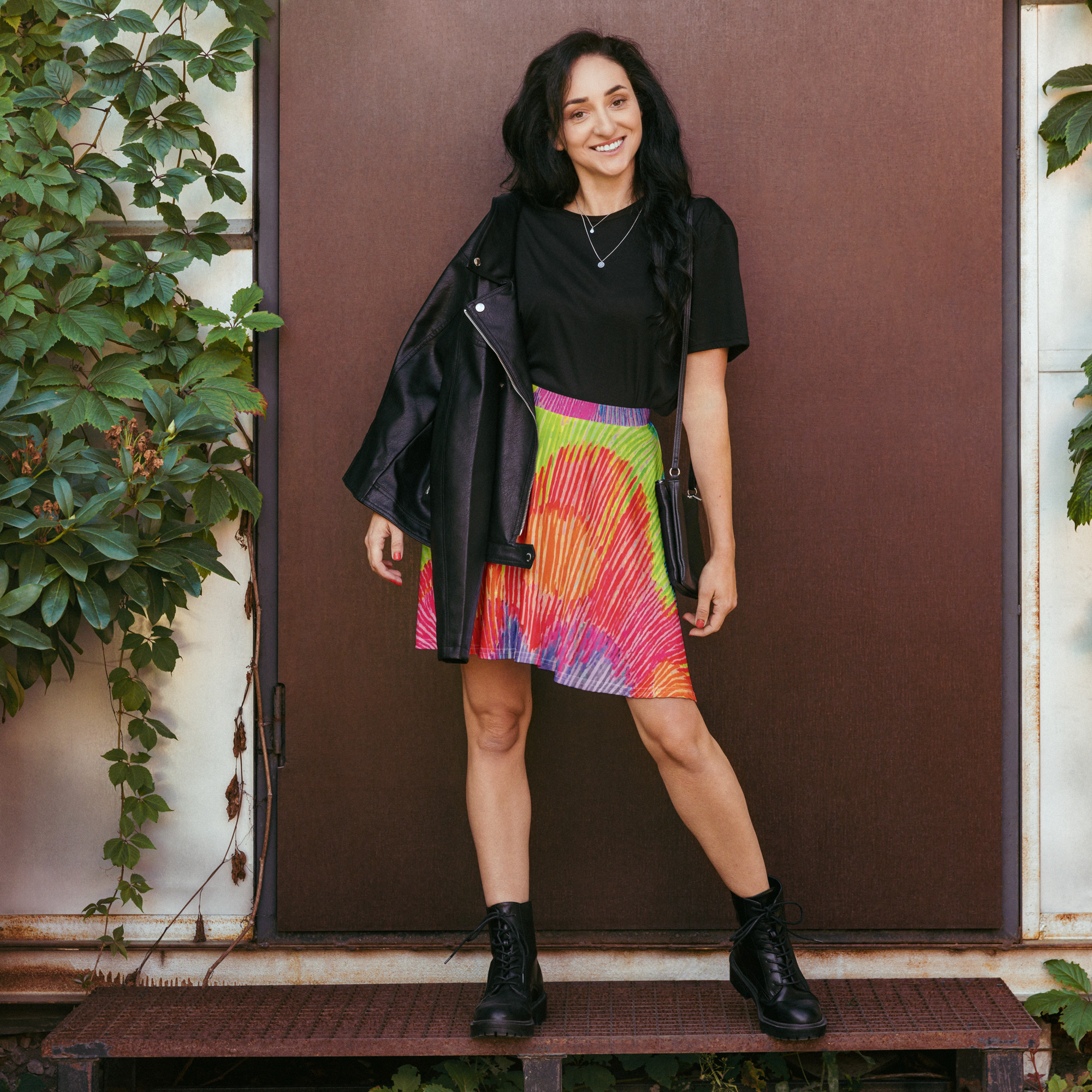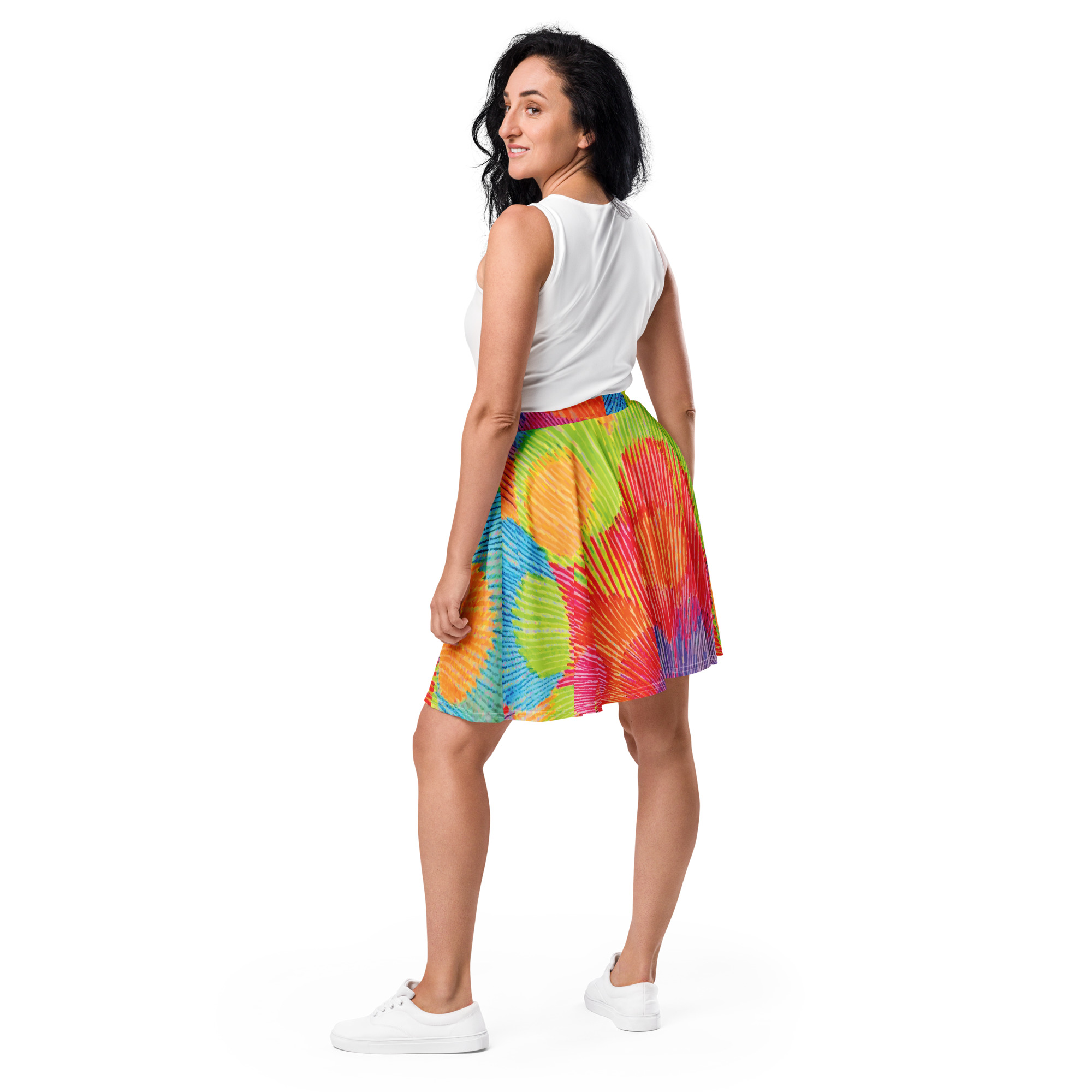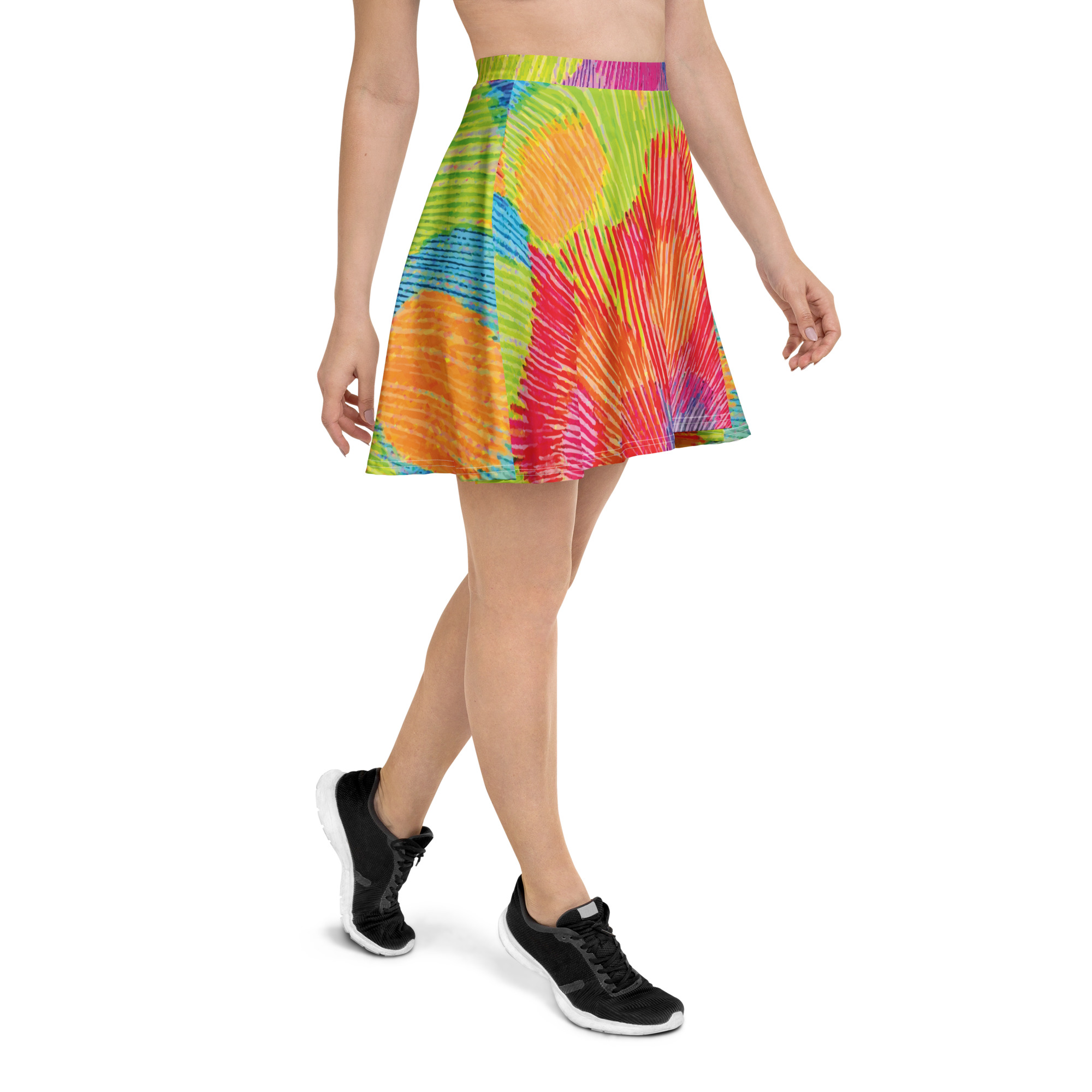 Twirl in full color with the Colour Echo skater skirt — a joyful burst of motion, energy, and vibrant spirit. Its blooming rings ripple outward like vibrations of celebration, turning every step into a playful expression of presence. Light, flattering, and full of life, this skirt doesn’t just move — it radiates.