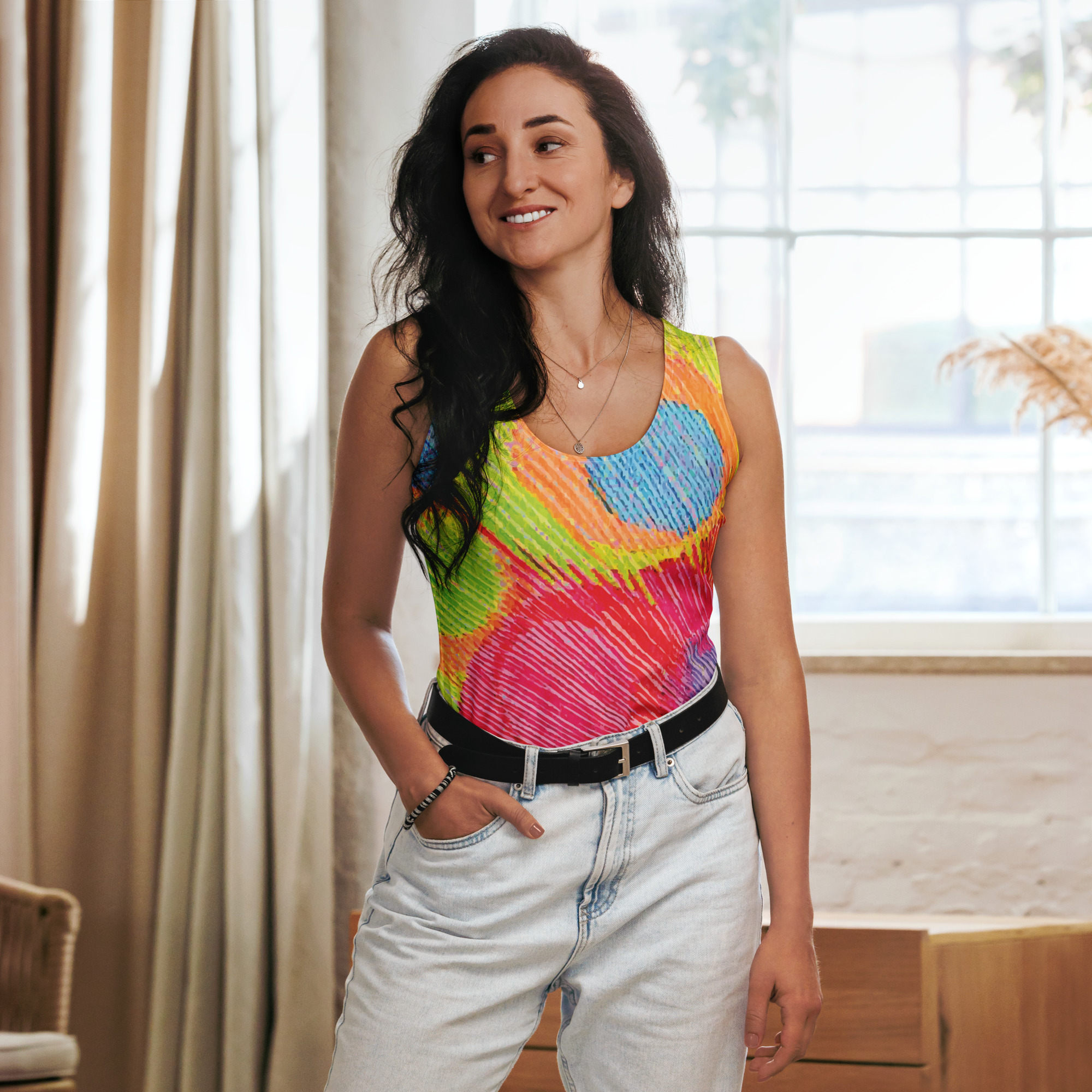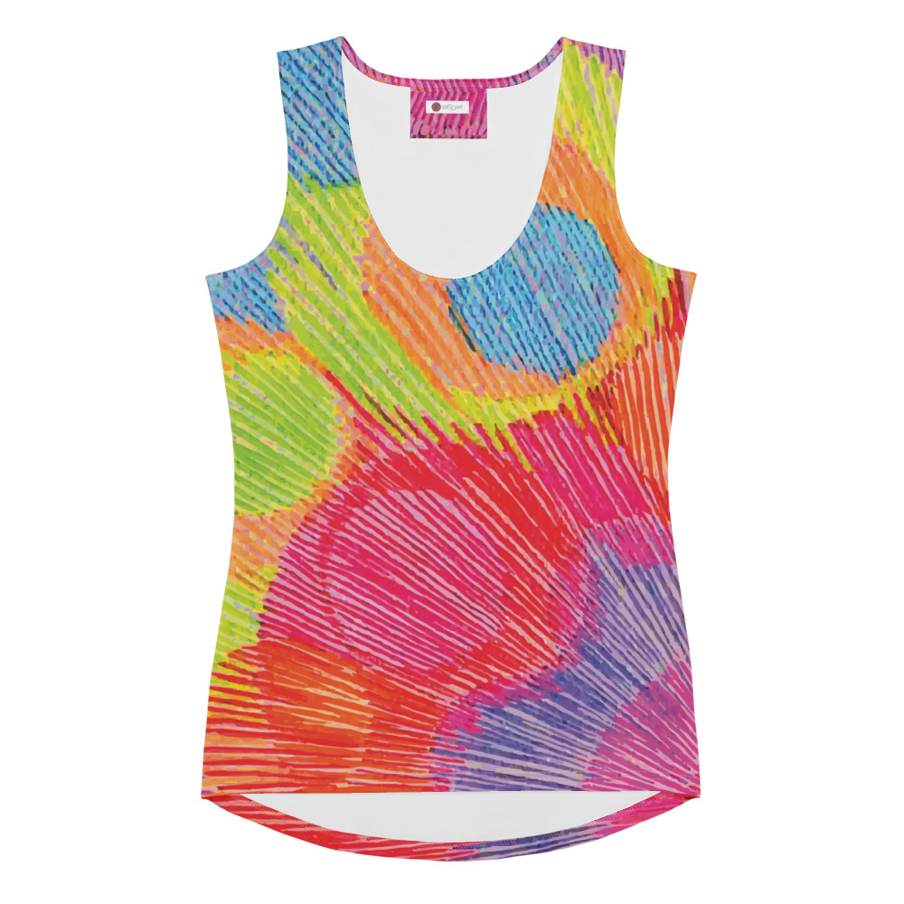Wear the pulse of joy with the Colour Echo tank top — a vibrant expression of energy, color, and fearless being. Featuring blooming rings that radiate from within, this lightweight and breathable top moves with you like a song of spirit in motion. Perfect for layering, lounging, or living out loud, it’s a wearable echo of your brightest self.