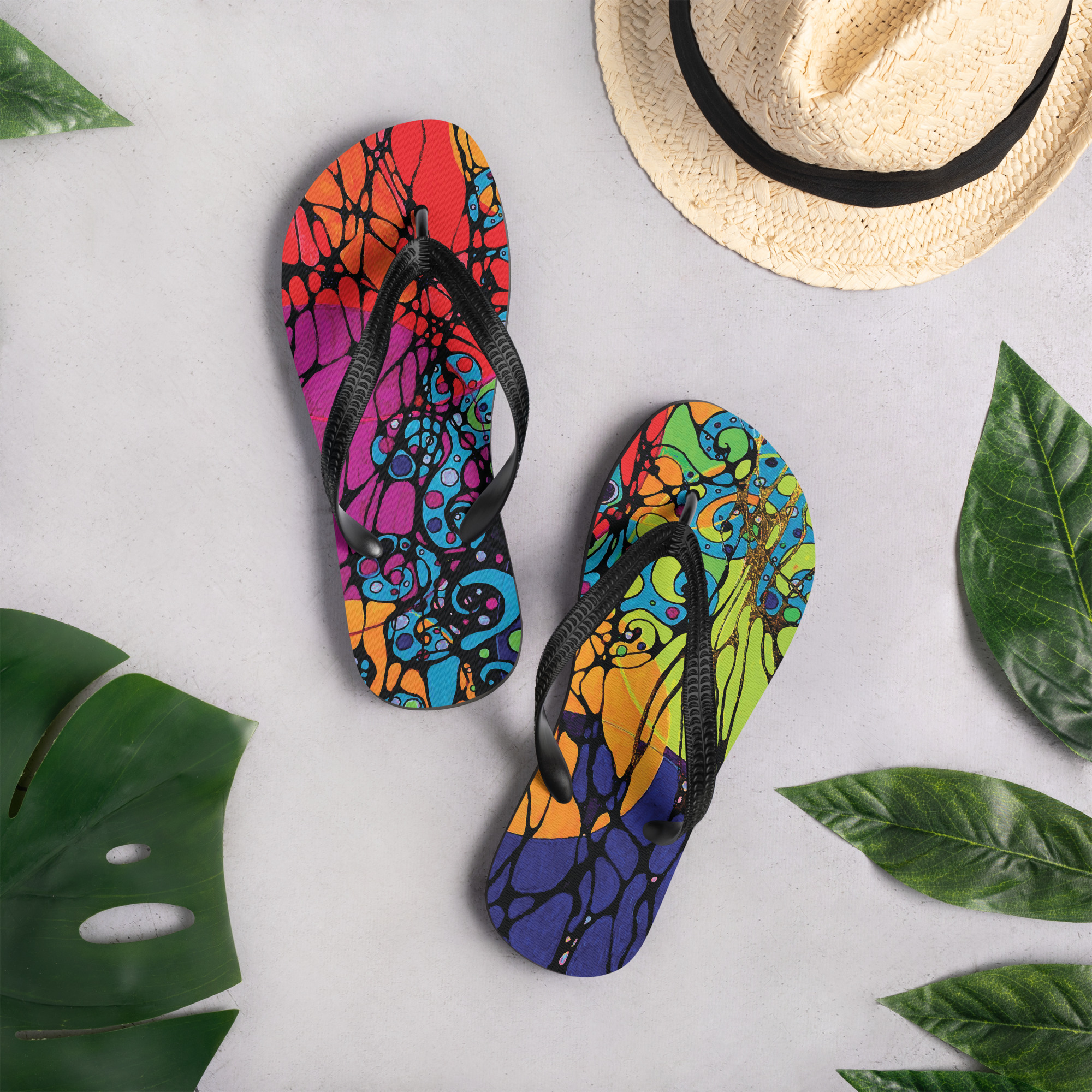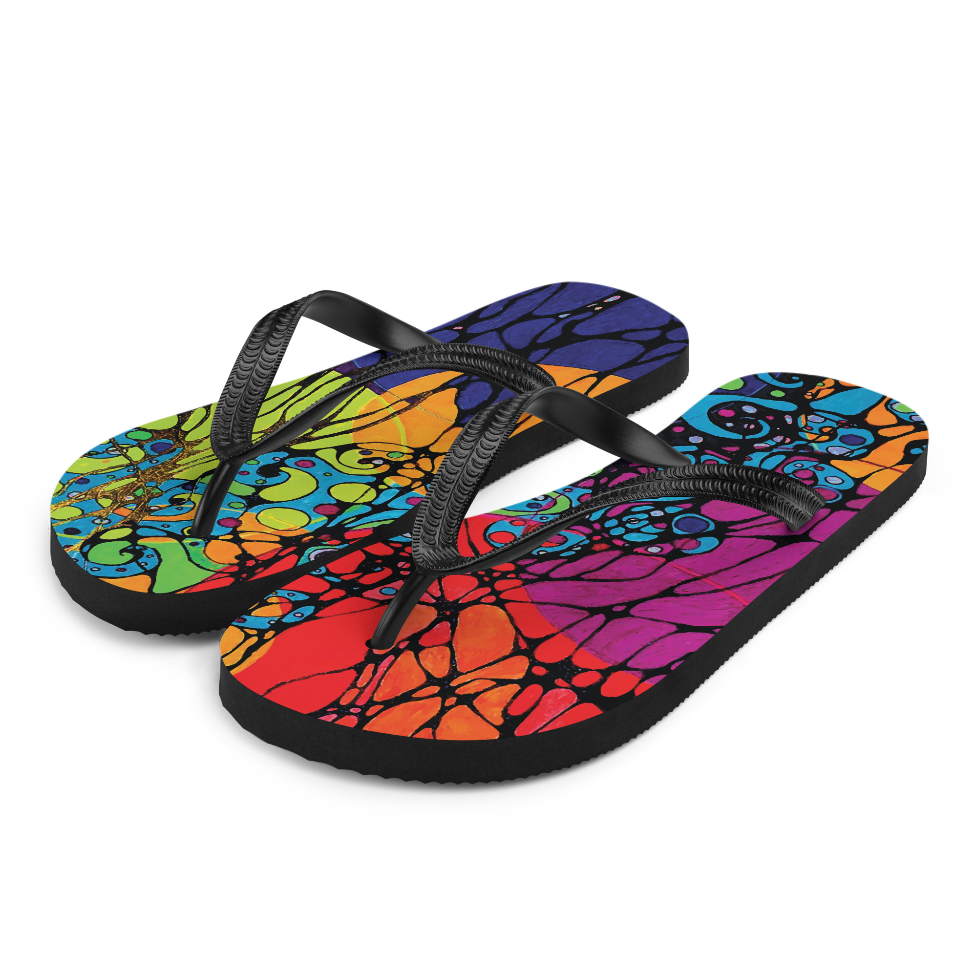 Step lightly into wholeness with the Connections flip flops — where every stride echoes healing and quiet strength. Featuring glowing, interconnected lines and soft color fields, these sandals are designed for comfort, movement, and meaning. Perfect for grounding moments, warm days, and journeys back to yourself.