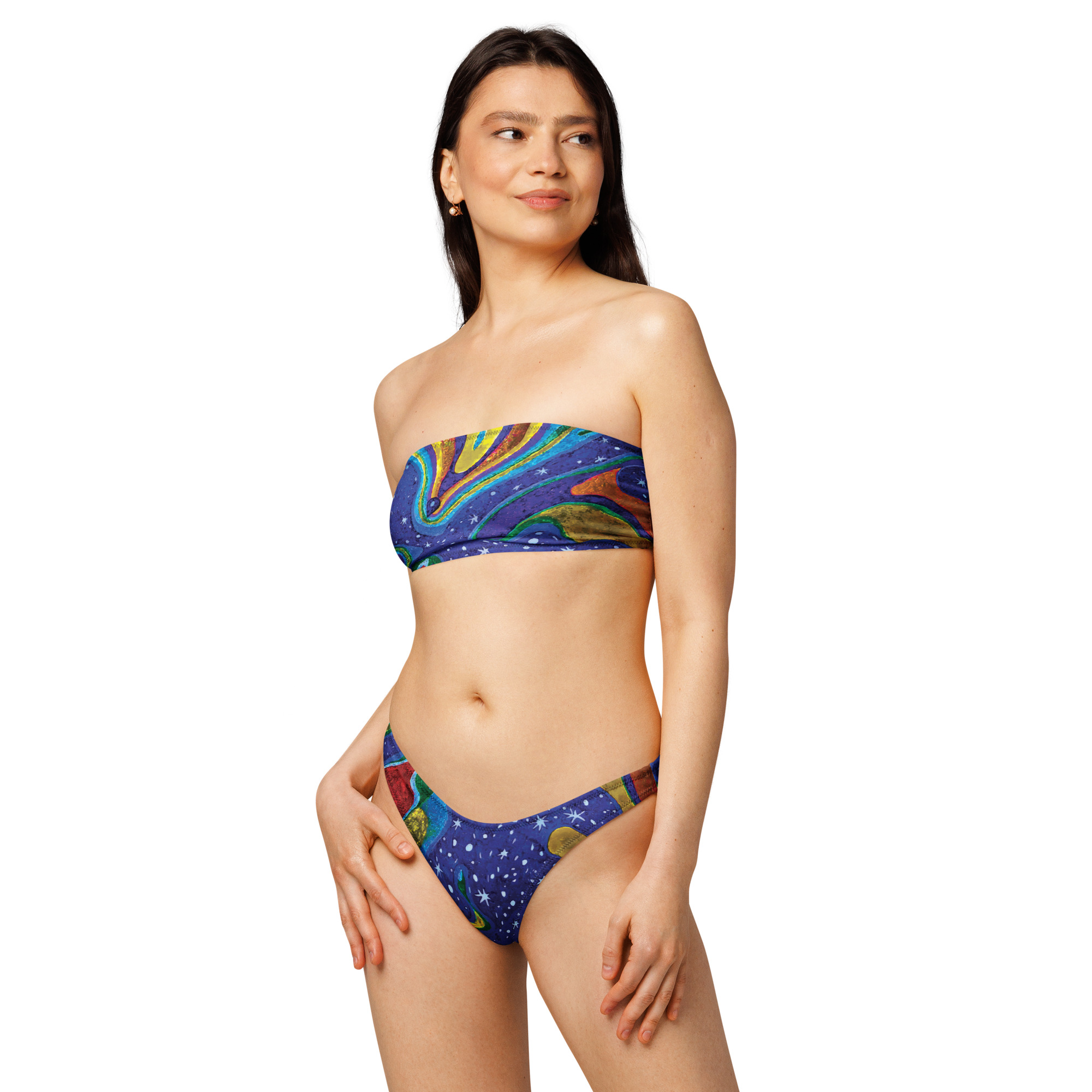 Bask in celestial stillness with the Dancing Stars bandeau bikini — a soft, star-kissed design that holds your form with grace. Flowing lines and deep cosmic hues create a look that’s both elegant and effortless. Feminine, grounding, and full of presence, it’s like wearing a constellation against your skin.