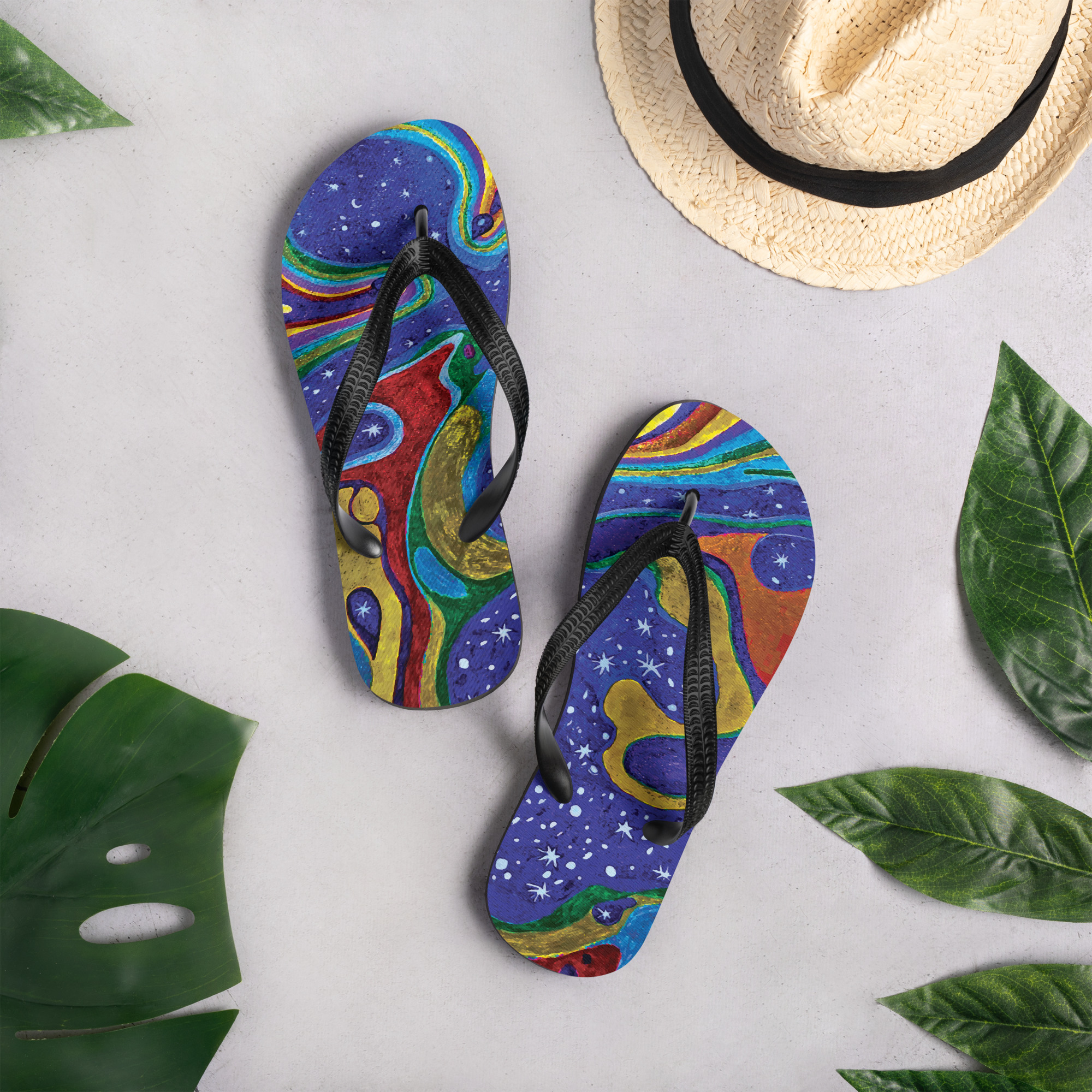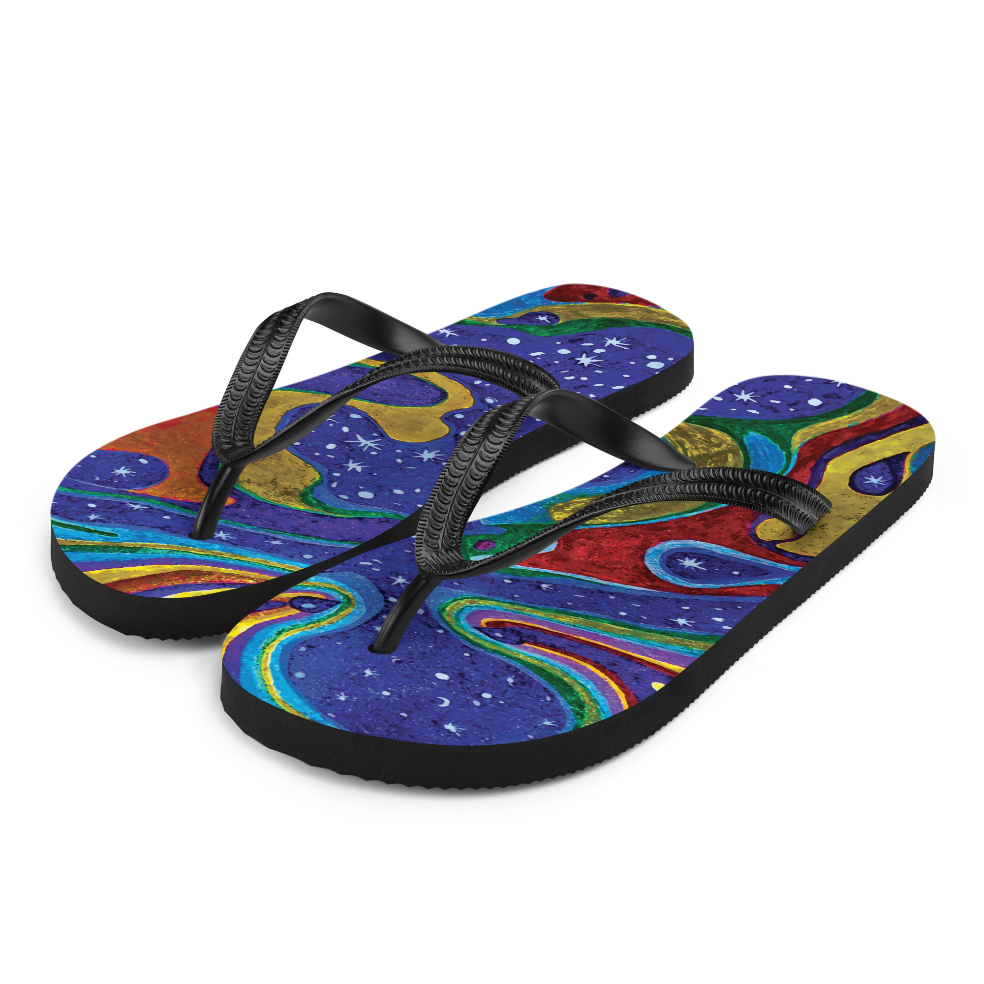 Step into cosmic calm with the Dancing Stars flip flops — a soft, starlit presence for your feet. With deep, flowing hues and constellations that shimmer with feminine grace, these sandals carry the quiet power of movement without effort. Comfortable, graceful, and full of celestial ease.